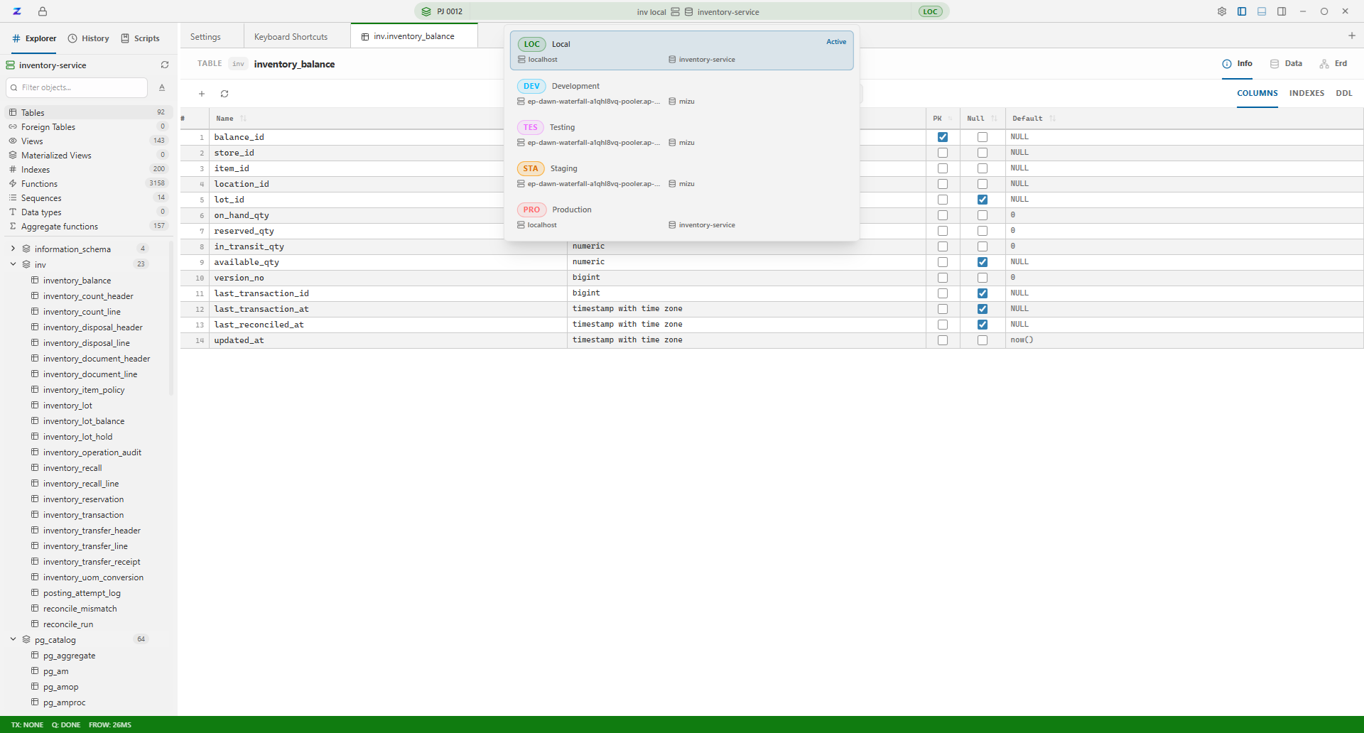 Environments are bound at the database level inside each project. Open Zentro, pick your project, pick your env — it connects automatically. No manual reconfiguring, ever.